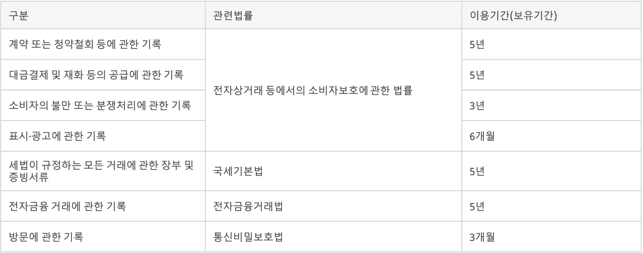 1) 회원 가입 정보 : 회원탈퇴 또는 계약 종료 시