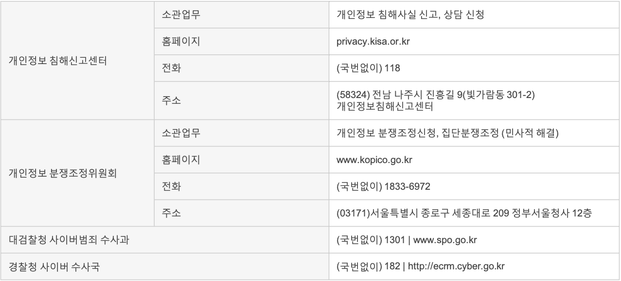 개인정보침해에 대한 신고나 상담이 필요하신 경우에는 아래 기관에 문의하시기 바랍니다.